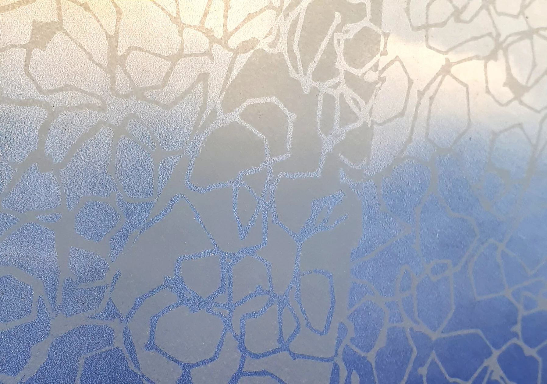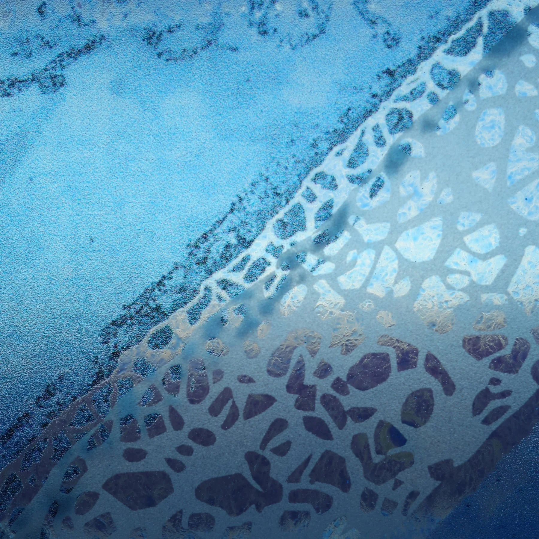Exploration of airbrushing, digital printing, etching, hand painting, deep sandblasting, and fire-polishing on glass, experimenting with textures and layered surfaces