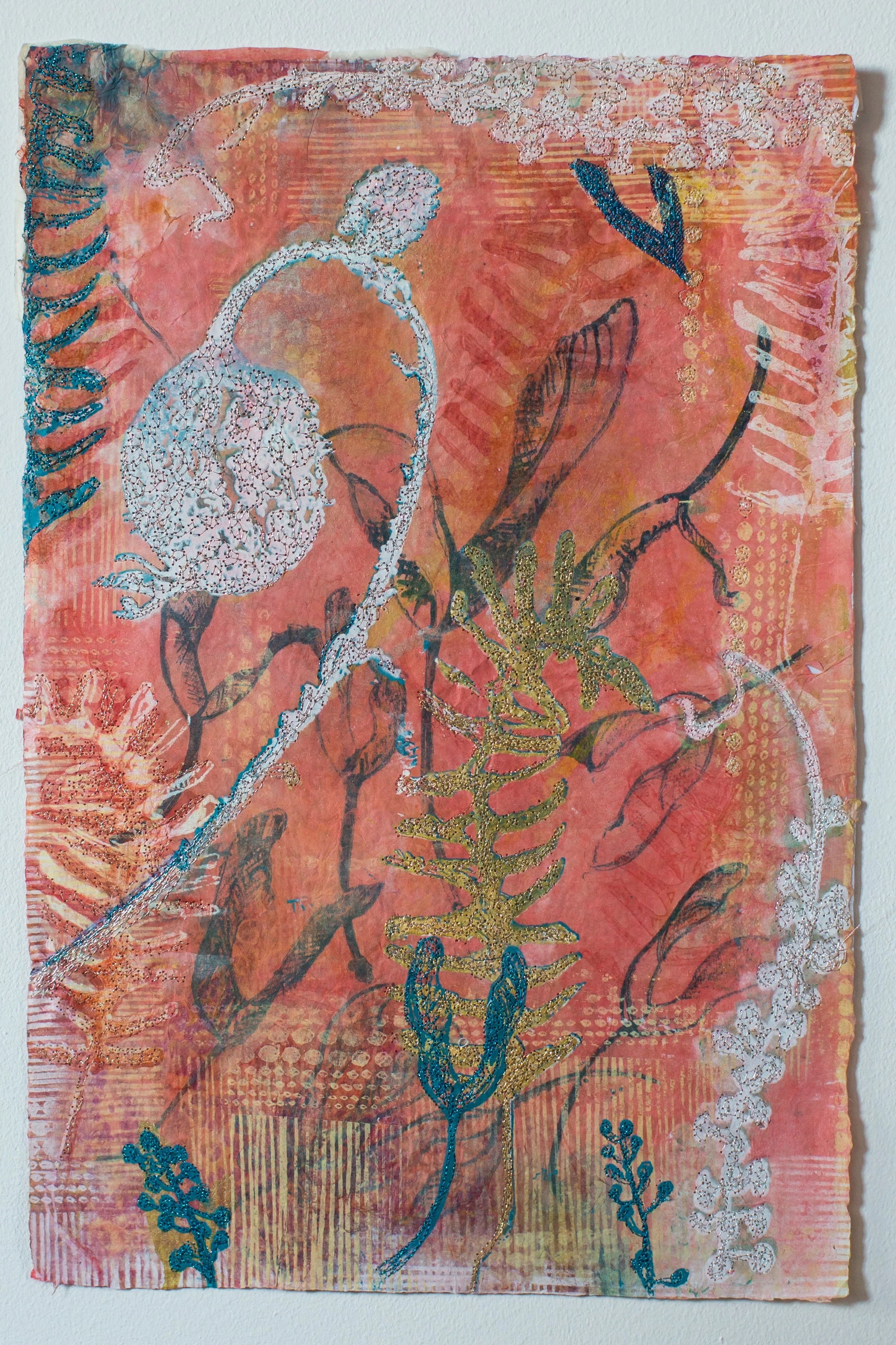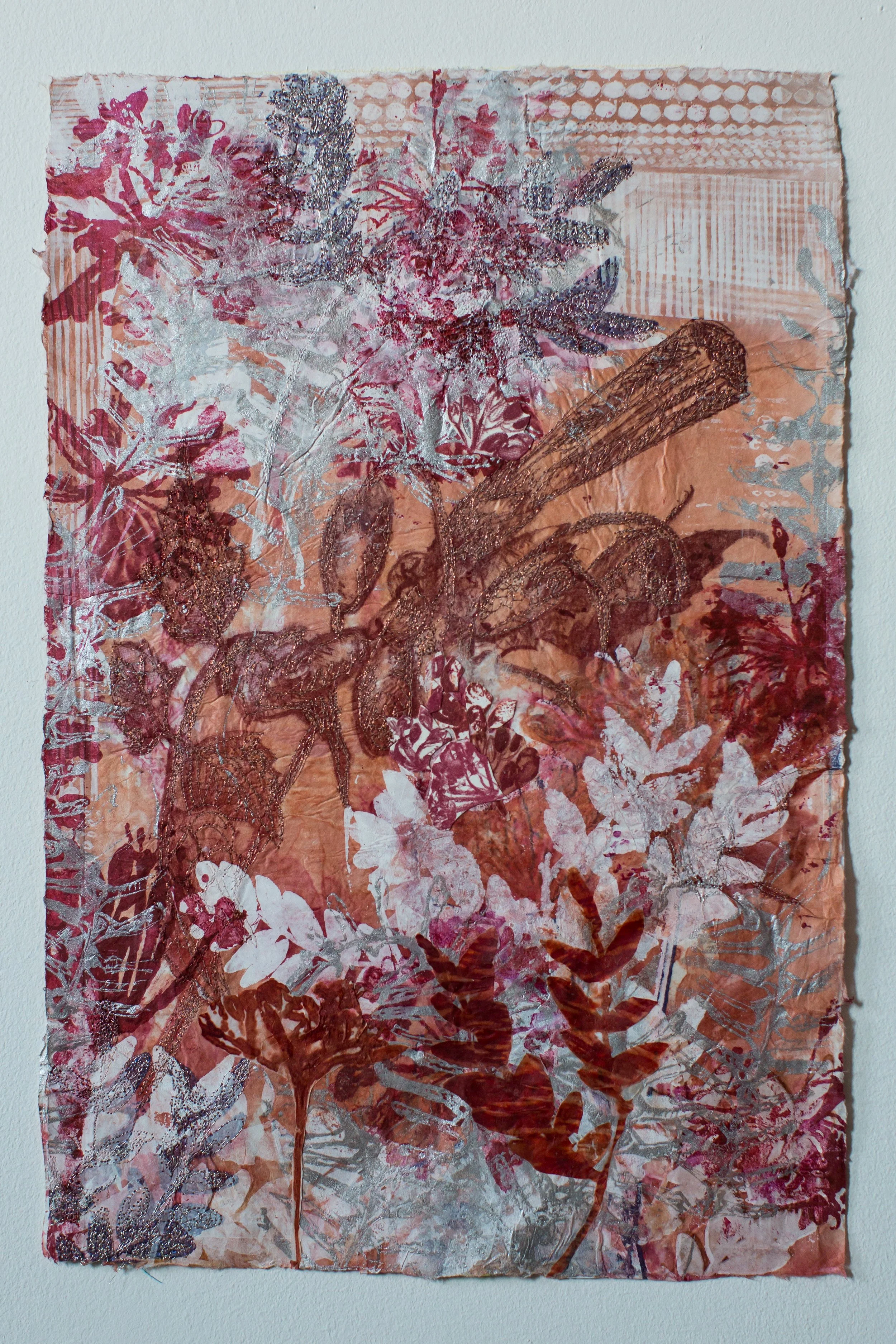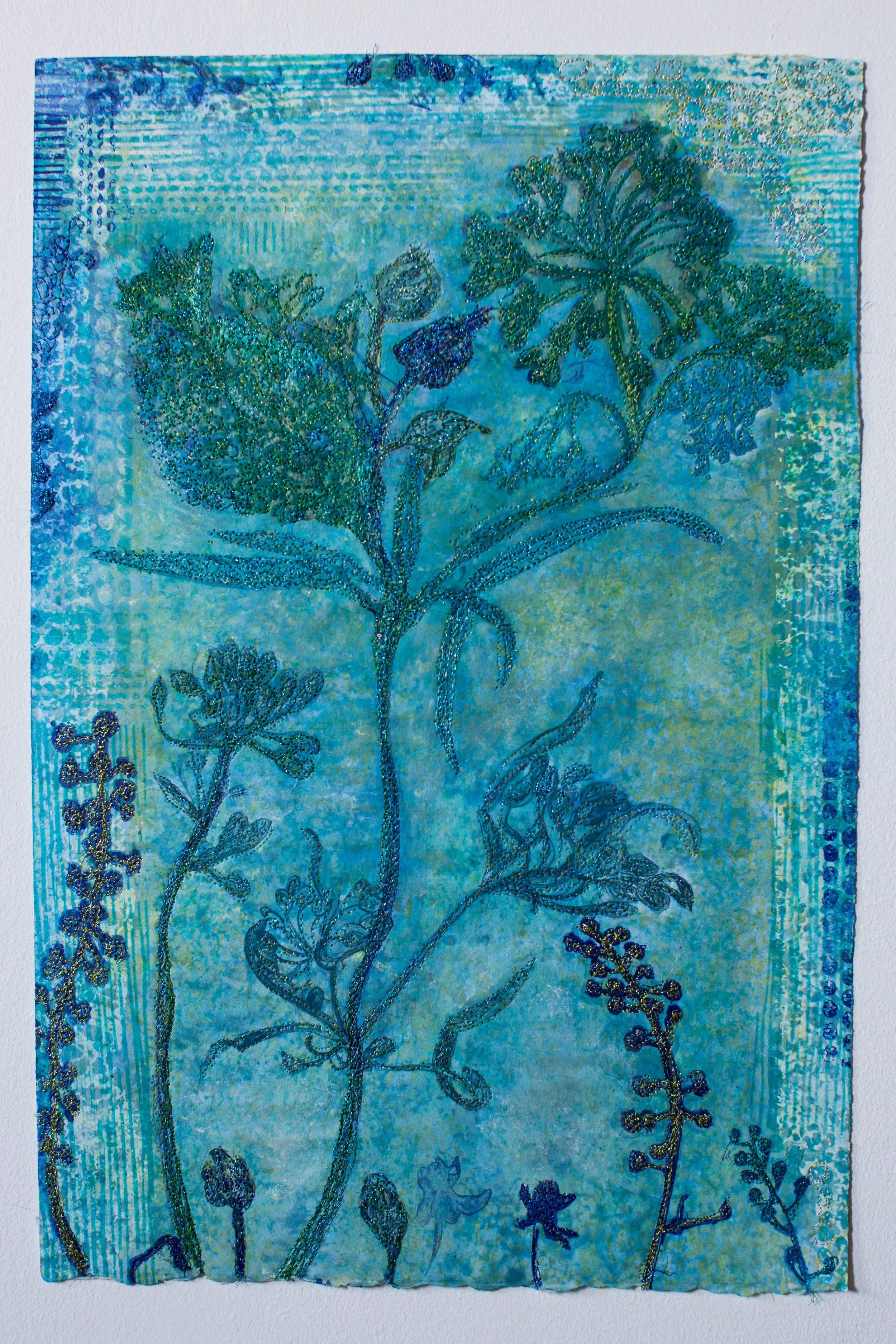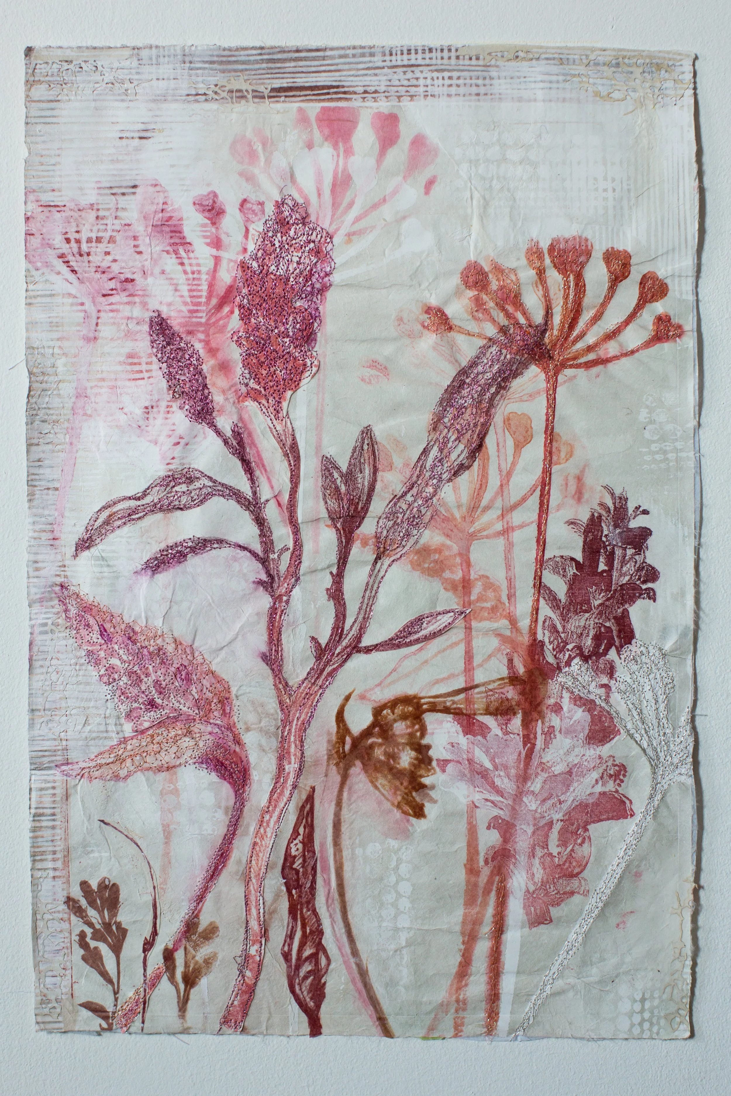 Plant-inspired prints on Kozo natural Japanese paper, combining lithography, monoprint, silkscreen, and machine embroidery.