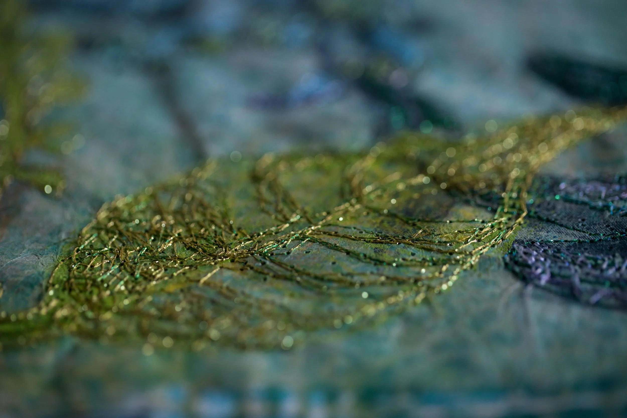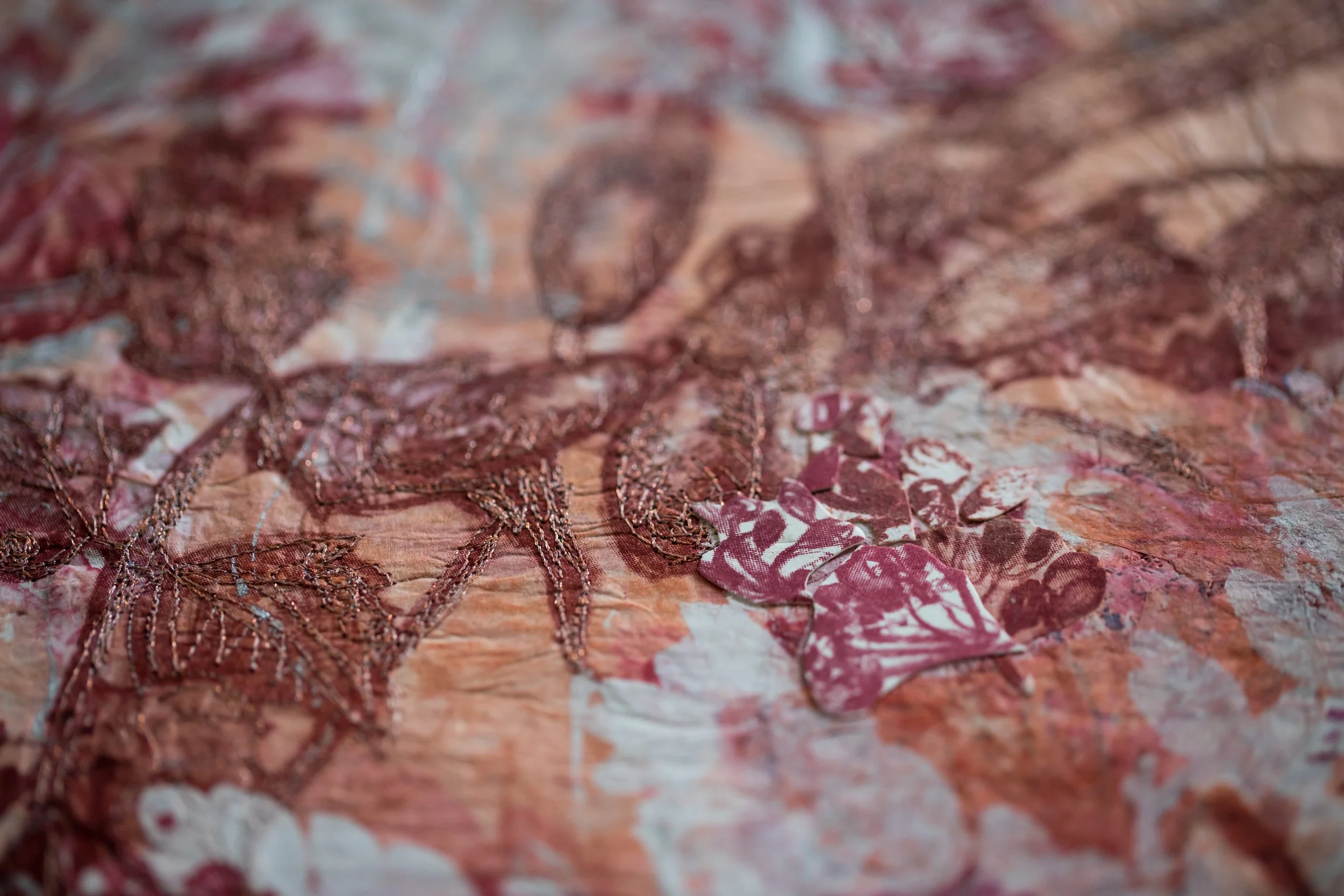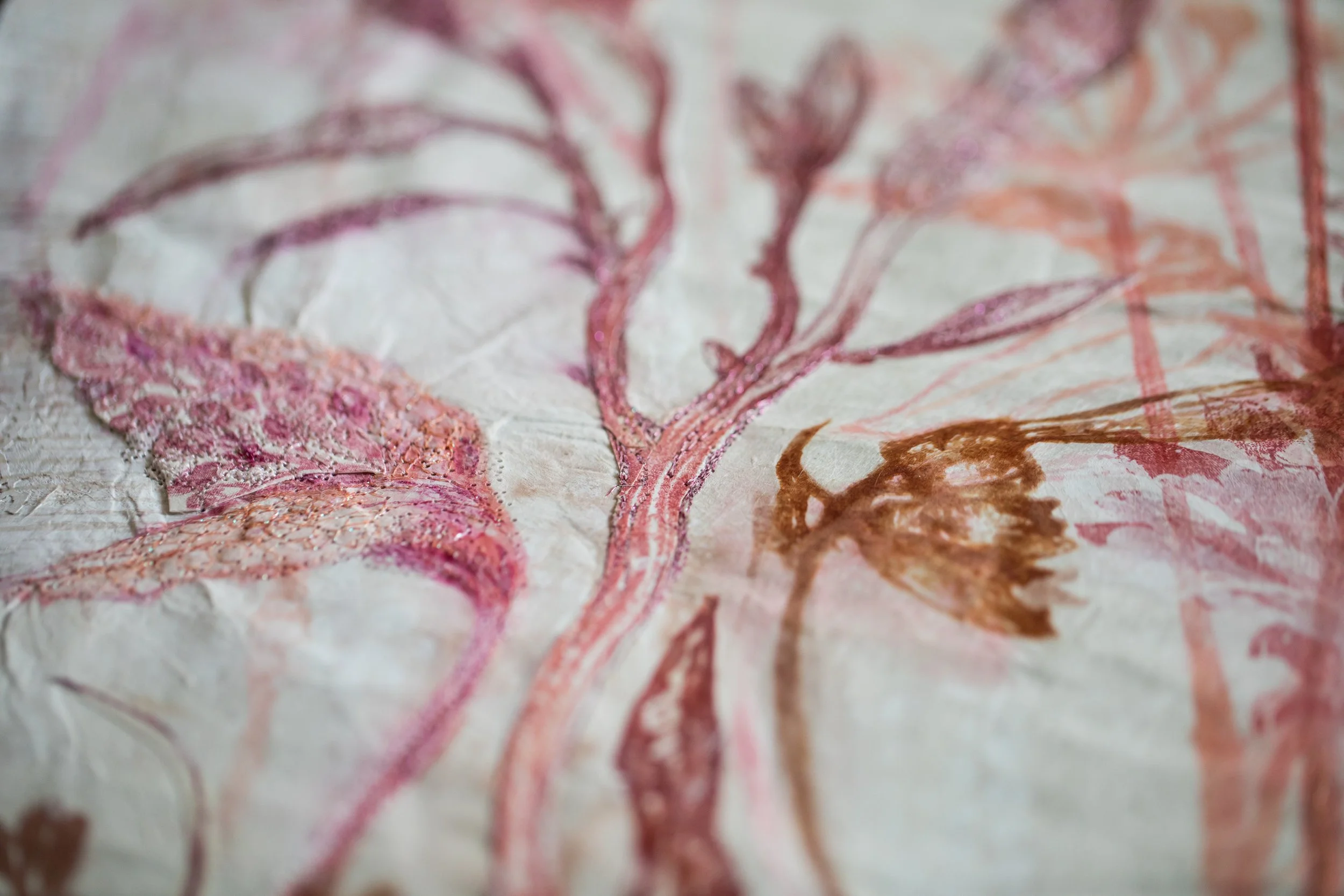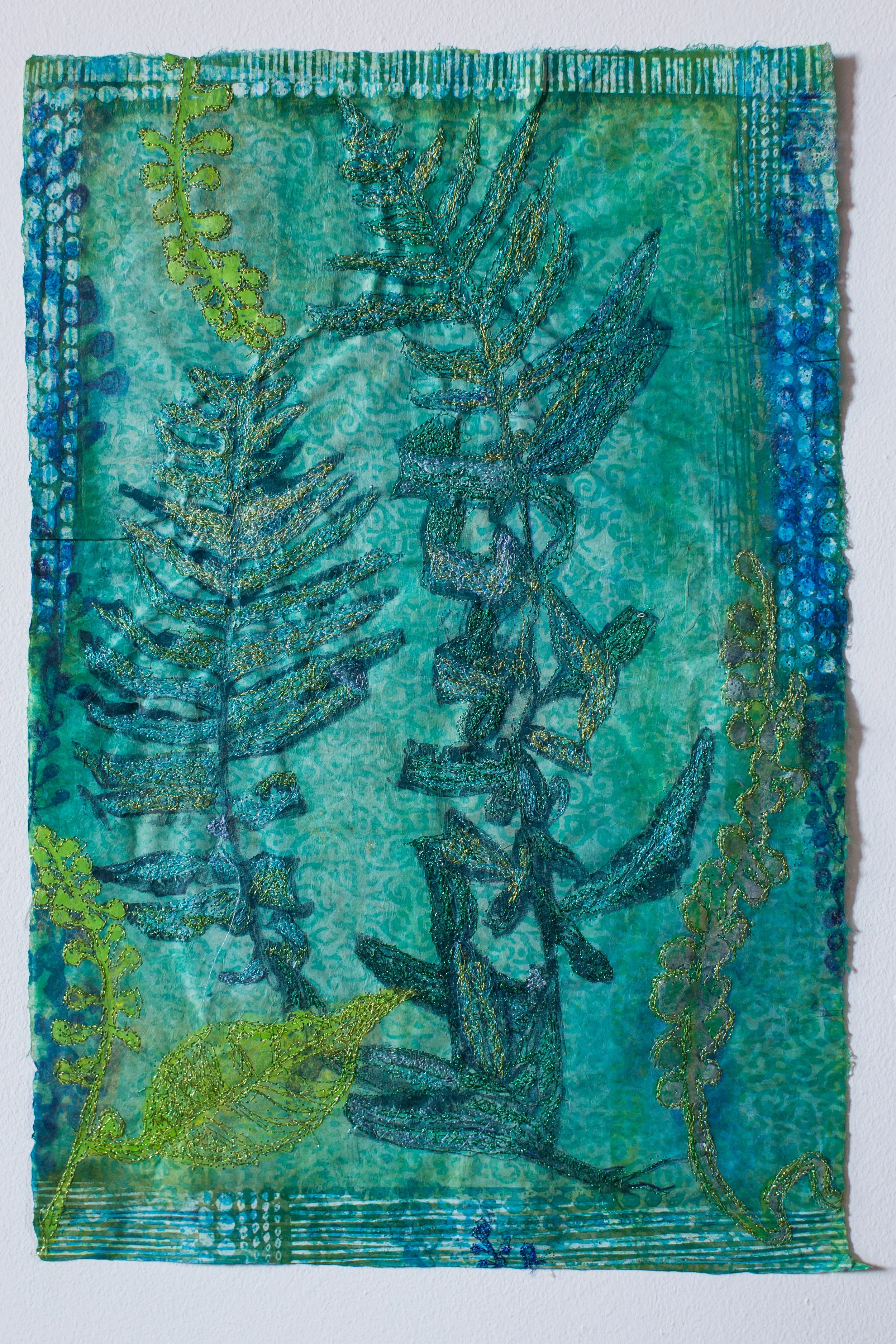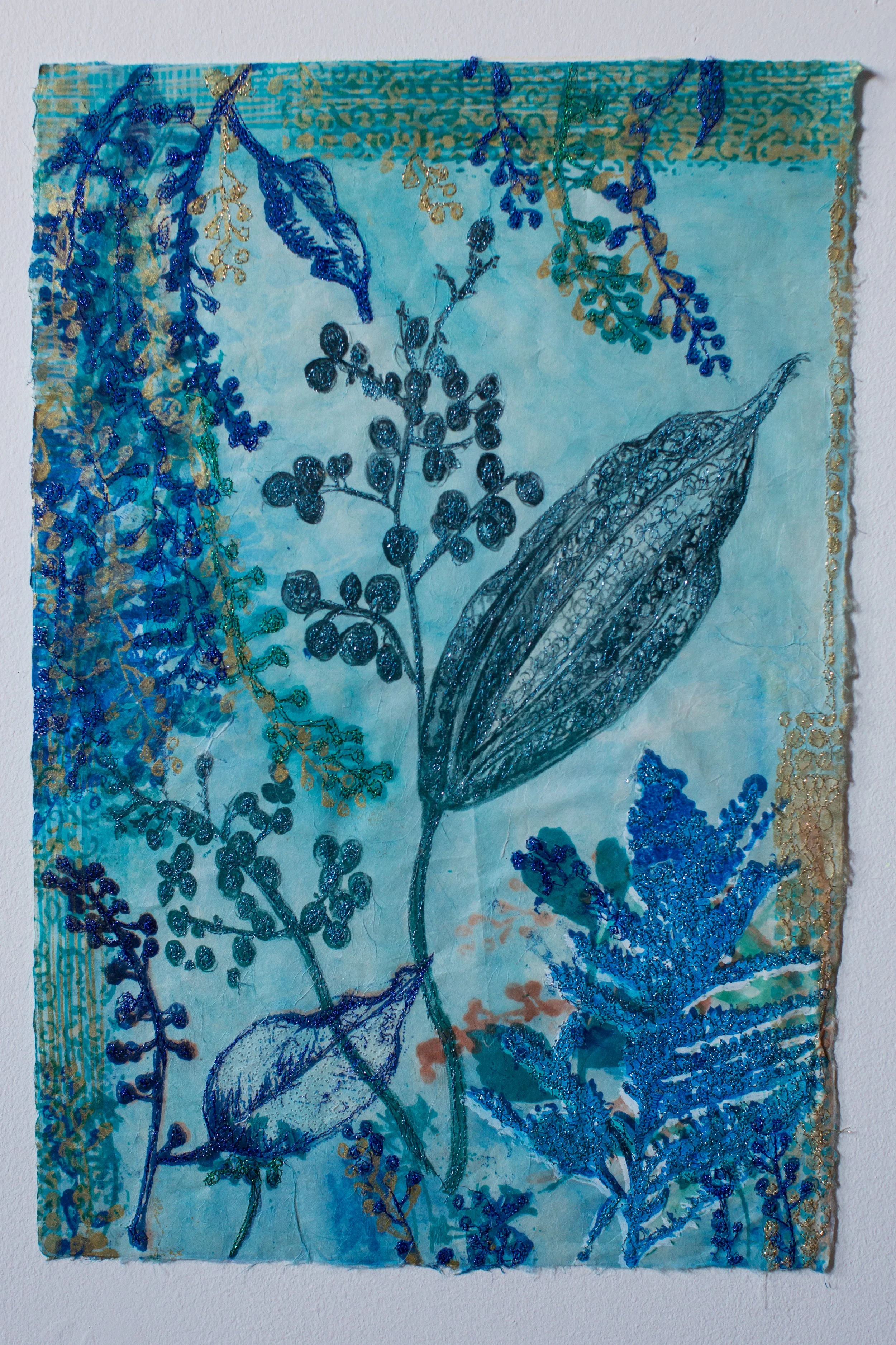 Plant-inspired prints on Kozo natural Japanese paper, combining lithography, monoprint, silkscreen, and machine embroidery.